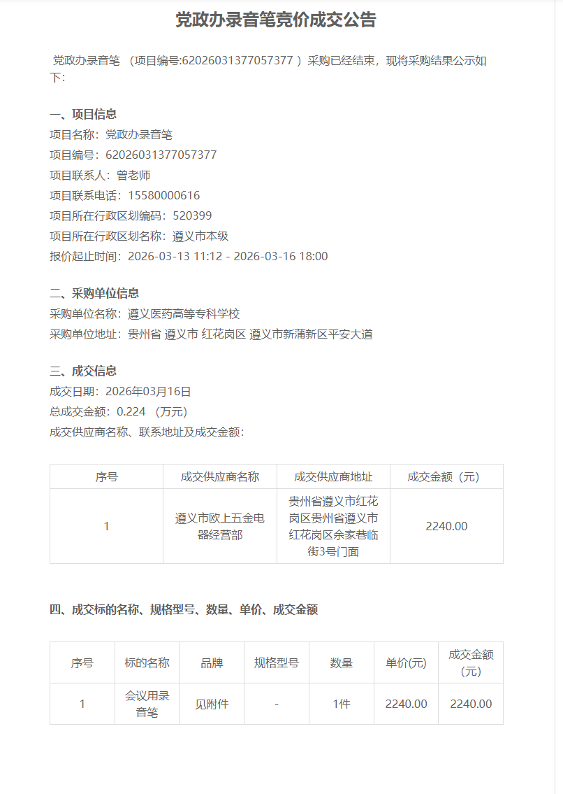 党政办录音笔竞价成交公告