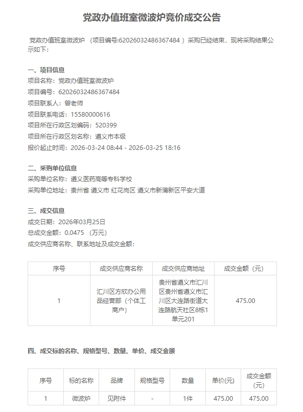 党政办值班室微波炉竞价成交公告